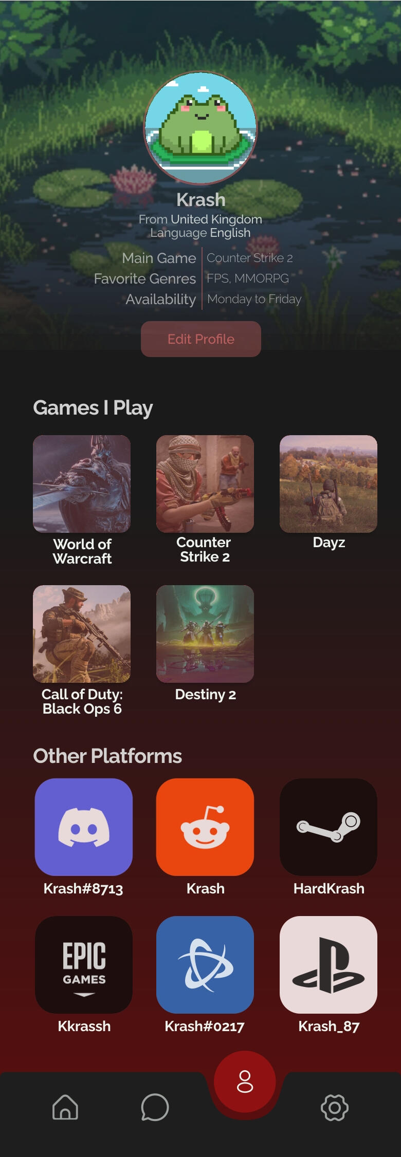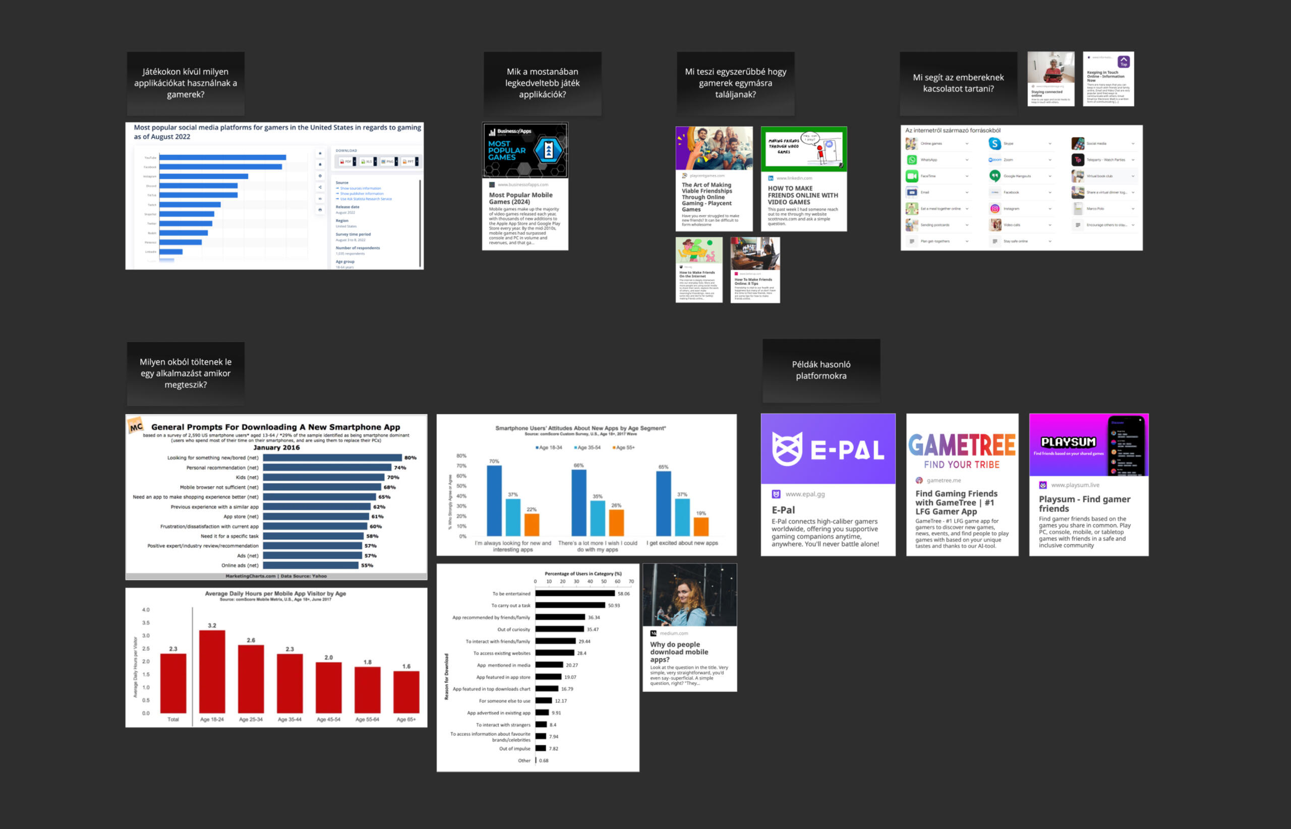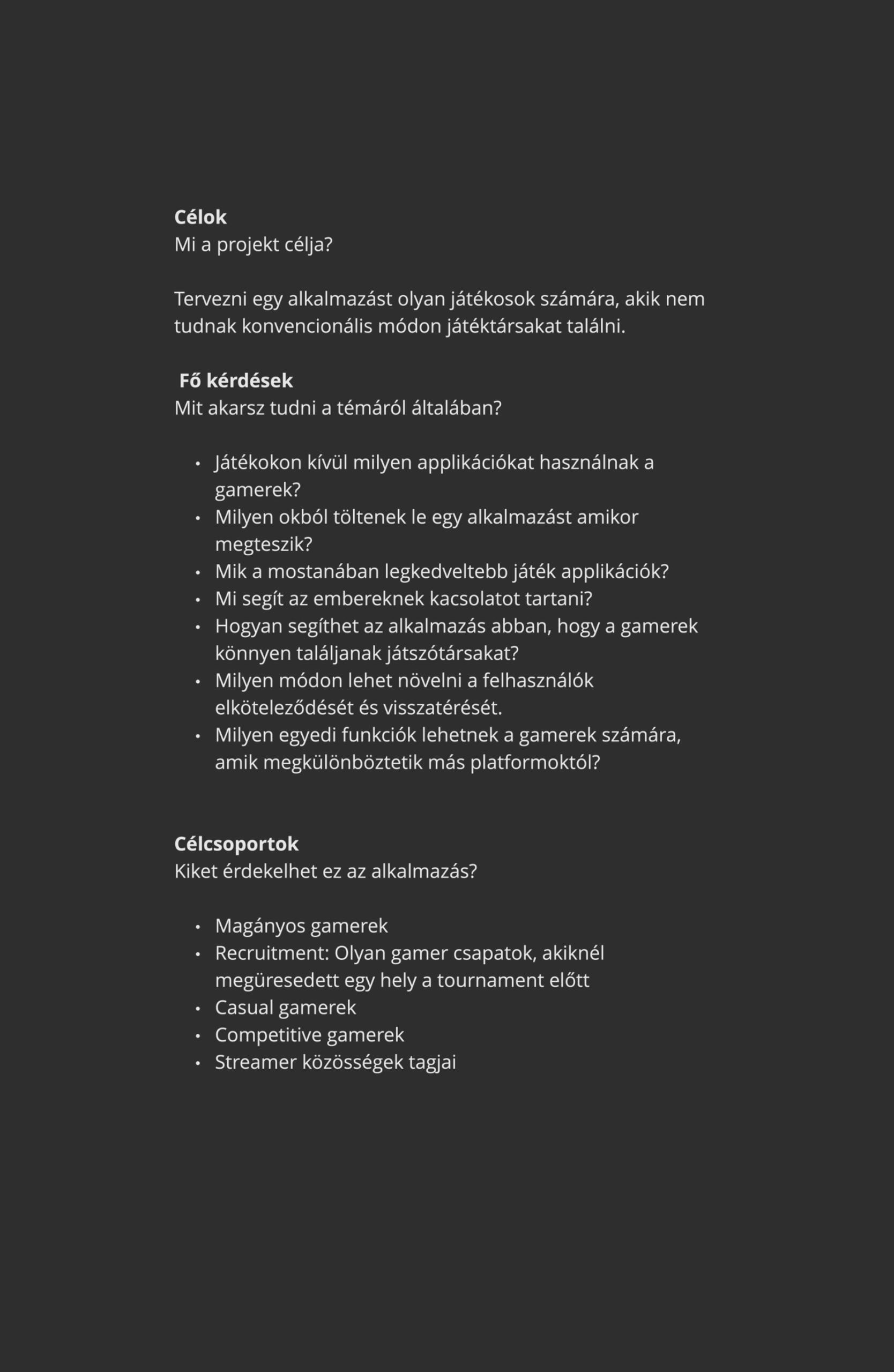 A cél egy olyan platform létrehozása volt, ahol a gamerek játékostársakat vagy akár új barátokat találhatnak. A projekt a kutatási szakasztól indulva a felhasználói igények feltérképezésén, wireframe készítésen és prototípusfejlesztésen át vezetett a kész alkalmazás vizuális megvalósításáig.
