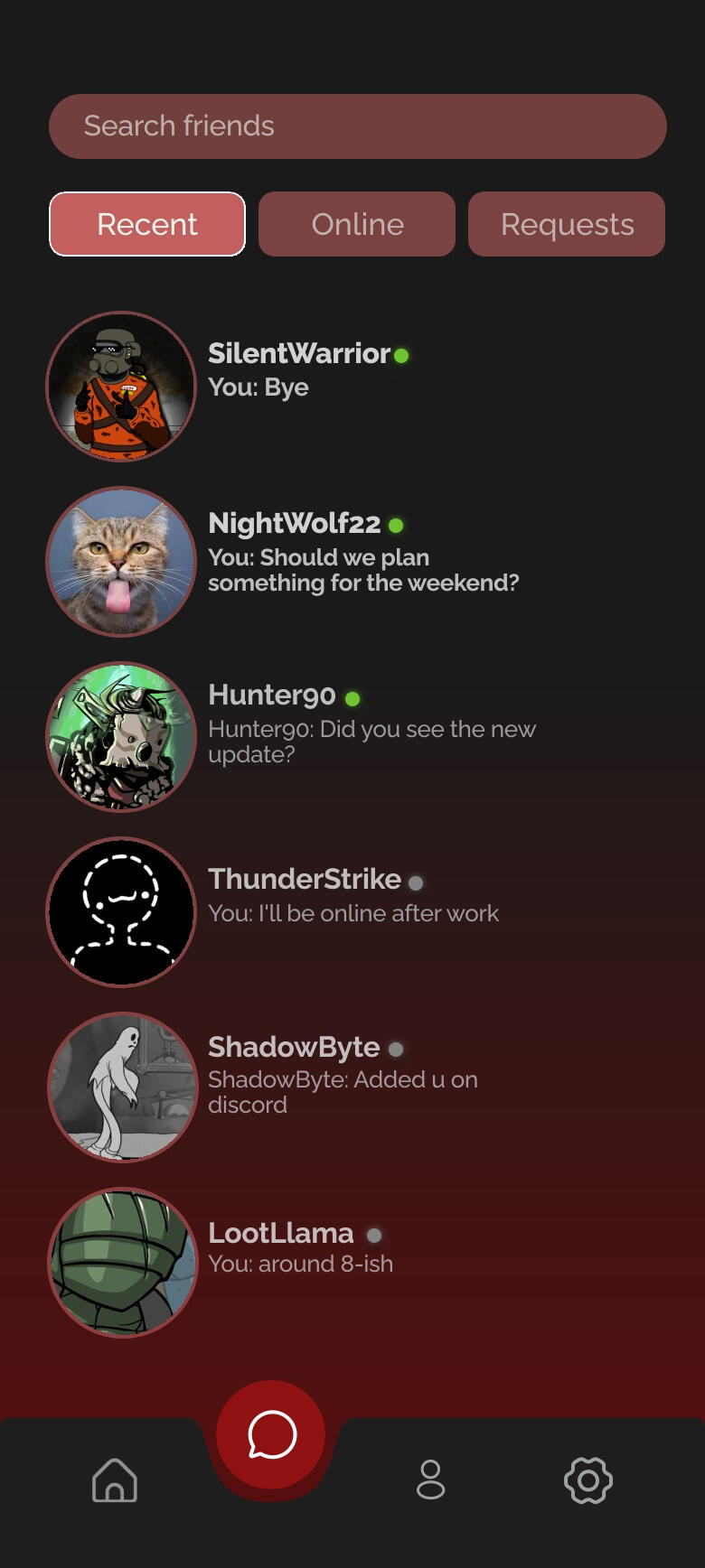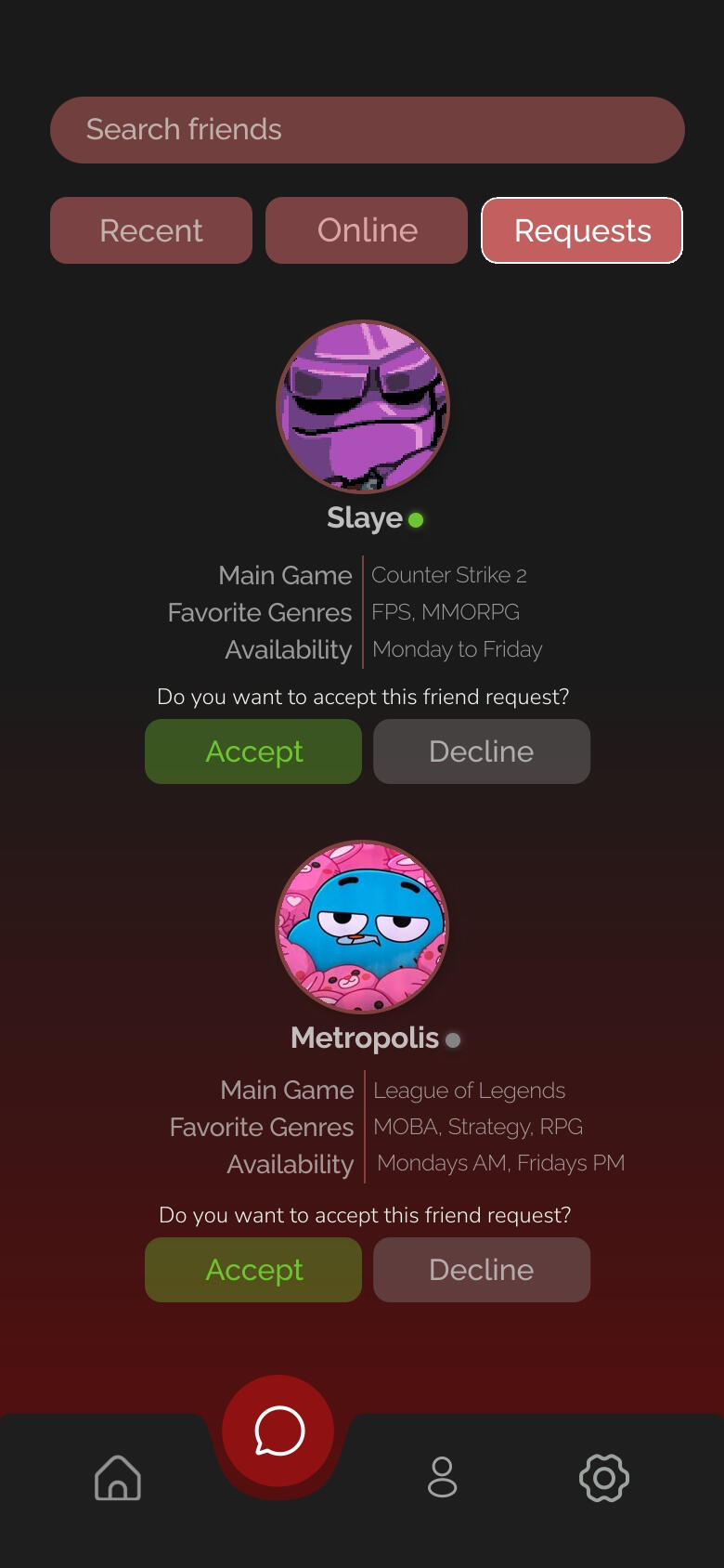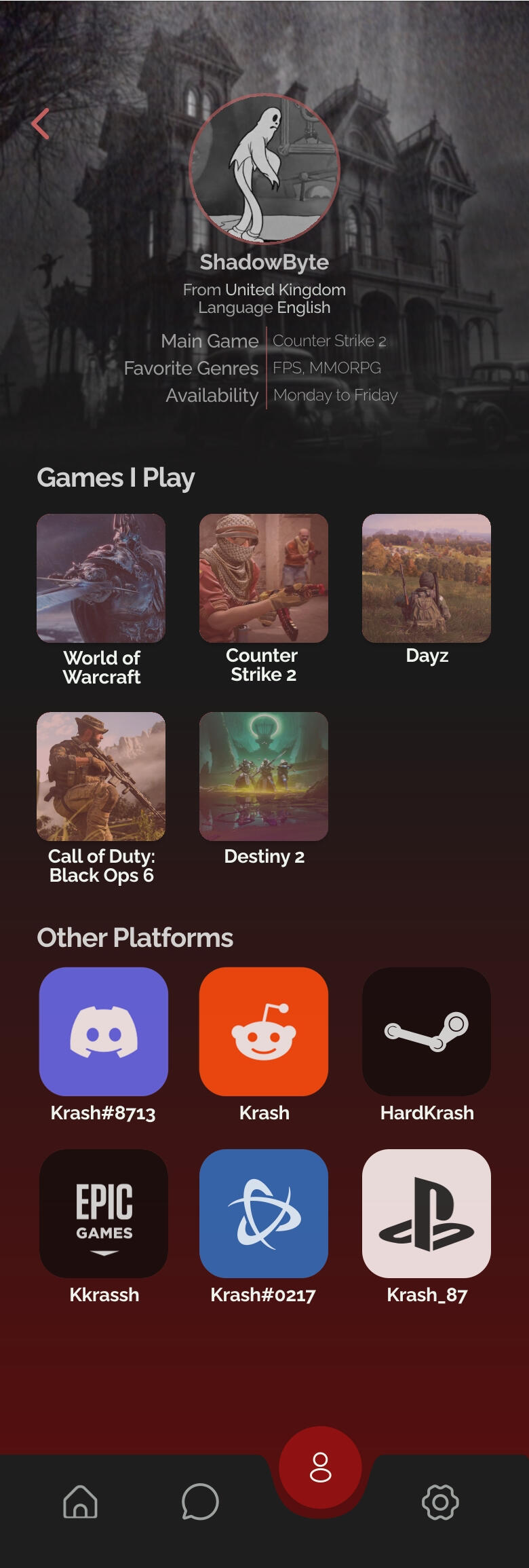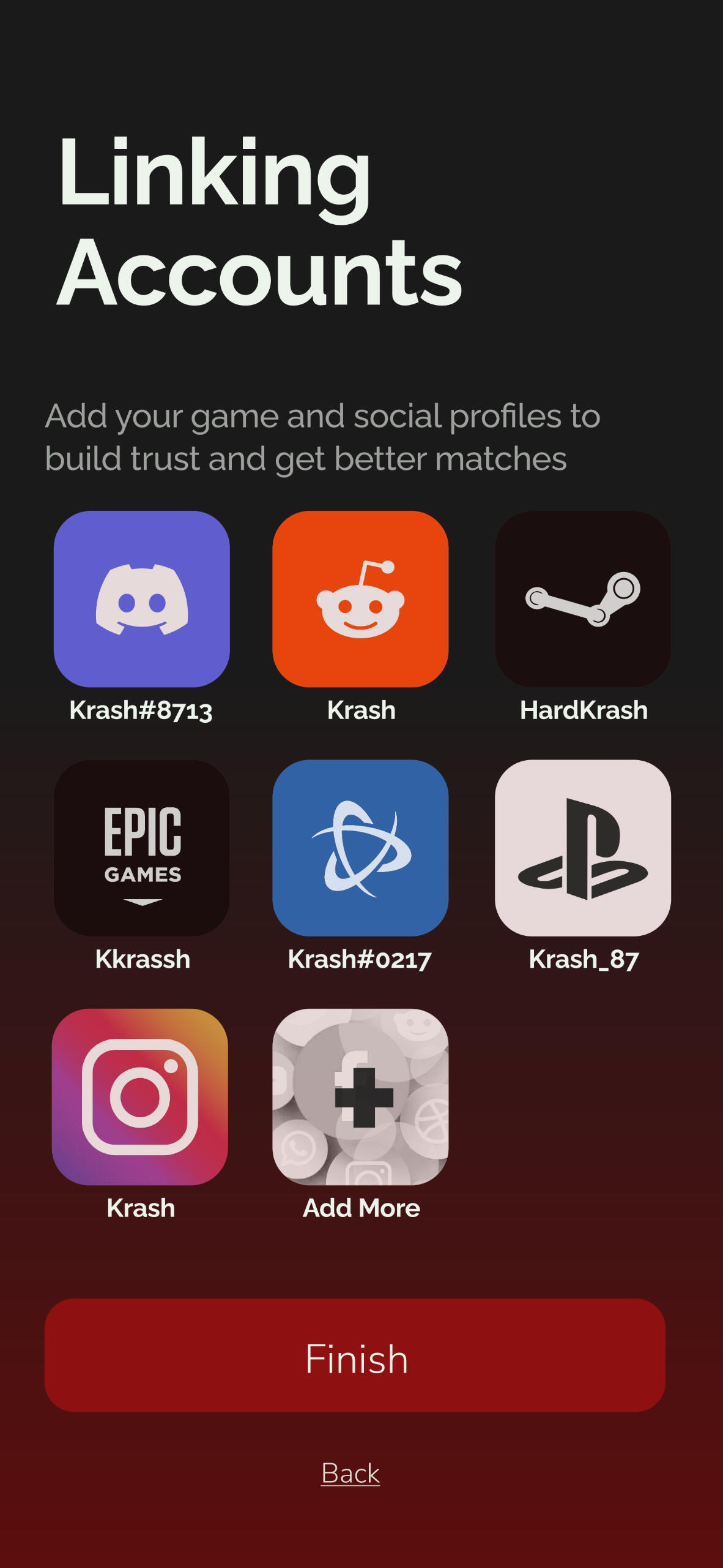 A cél egy olyan platform létrehozása volt, ahol a gamerek játékostársakat vagy akár új barátokat találhatnak. A projekt a kutatási szakasztól indulva a felhasználói igények feltérképezésén, wireframe készítésen és prototípusfejlesztésen át vezetett a kész alkalmazás vizuális megvalósításáig.