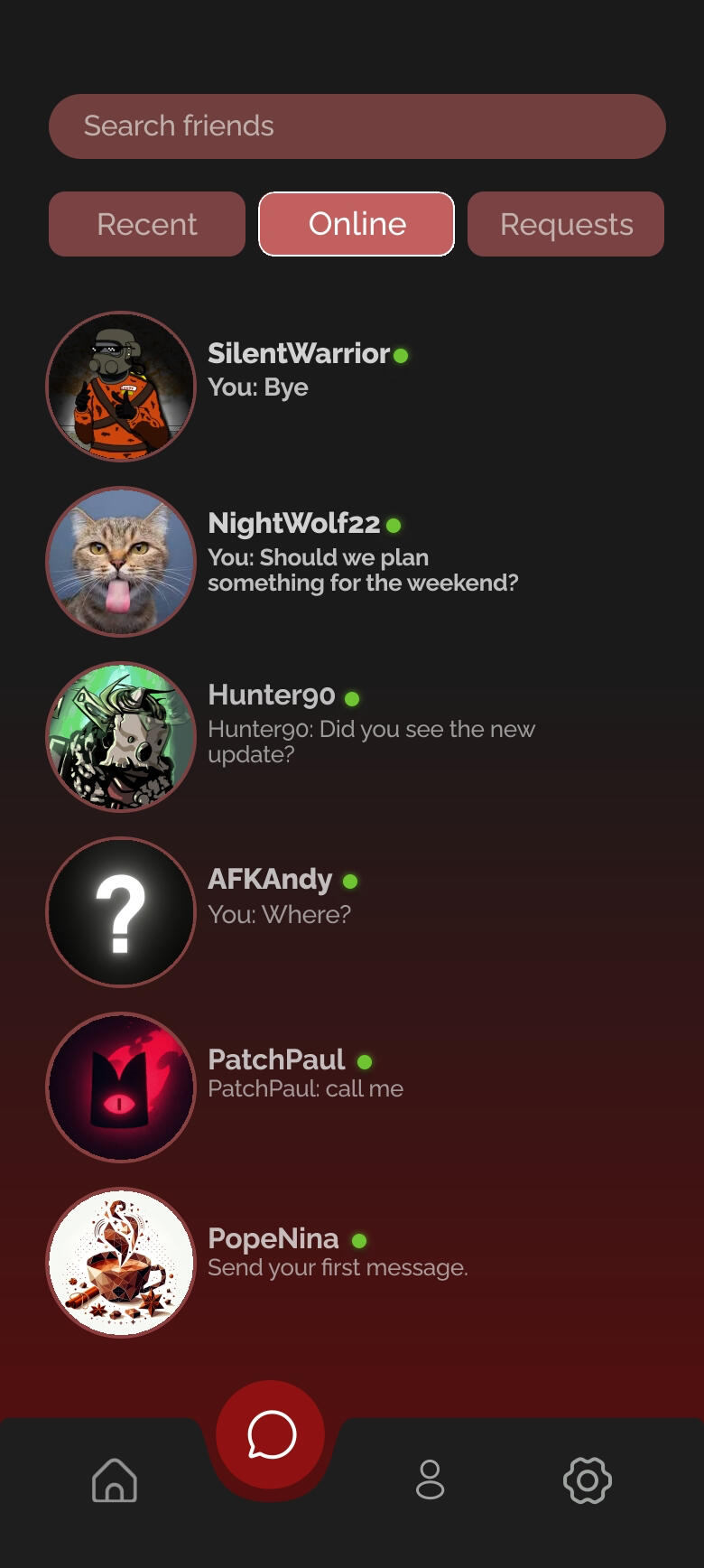 Az alkalmazás minden elkészült képernyője megtekinthető, a főmenütől a beállításokon és profiloldalon át a chatfelületig. A végleges UI-tervek egységes vizuális nyelvet követnek, amelyet a korábban bemutatott UX-elvek és felhasználói igények alapján alakítottam ki. A felületek Figma programban készültek.
