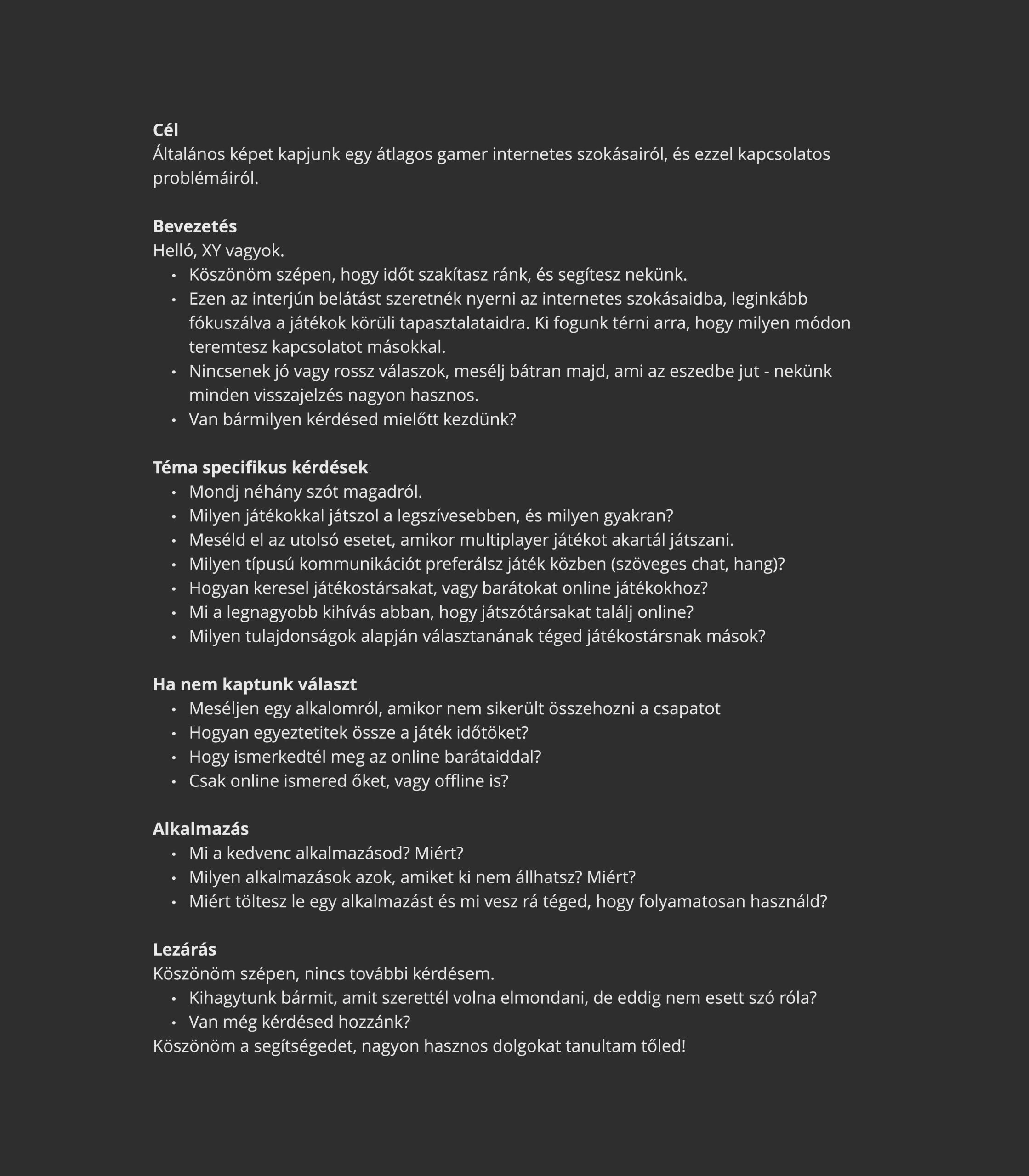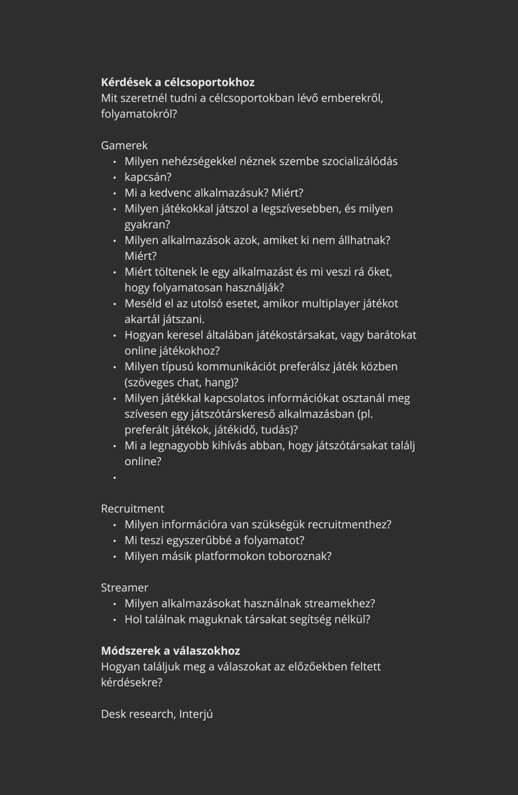 Ebben a szekcióban az alkalmazás tervezését megelőző kutatási folyamat lépéseit mutatom be. A kutatást hárman végeztük, de a végső designtervezés teljes egészében az én munkám. A cél az volt, hogy valódi felhasználói igényeket és problémákat tárjunk fel, és ezekre építve hozzunk létre egy átgondolt, funkcionális felhasználói élményt.
