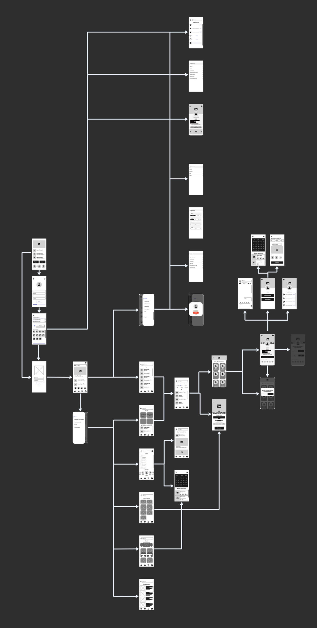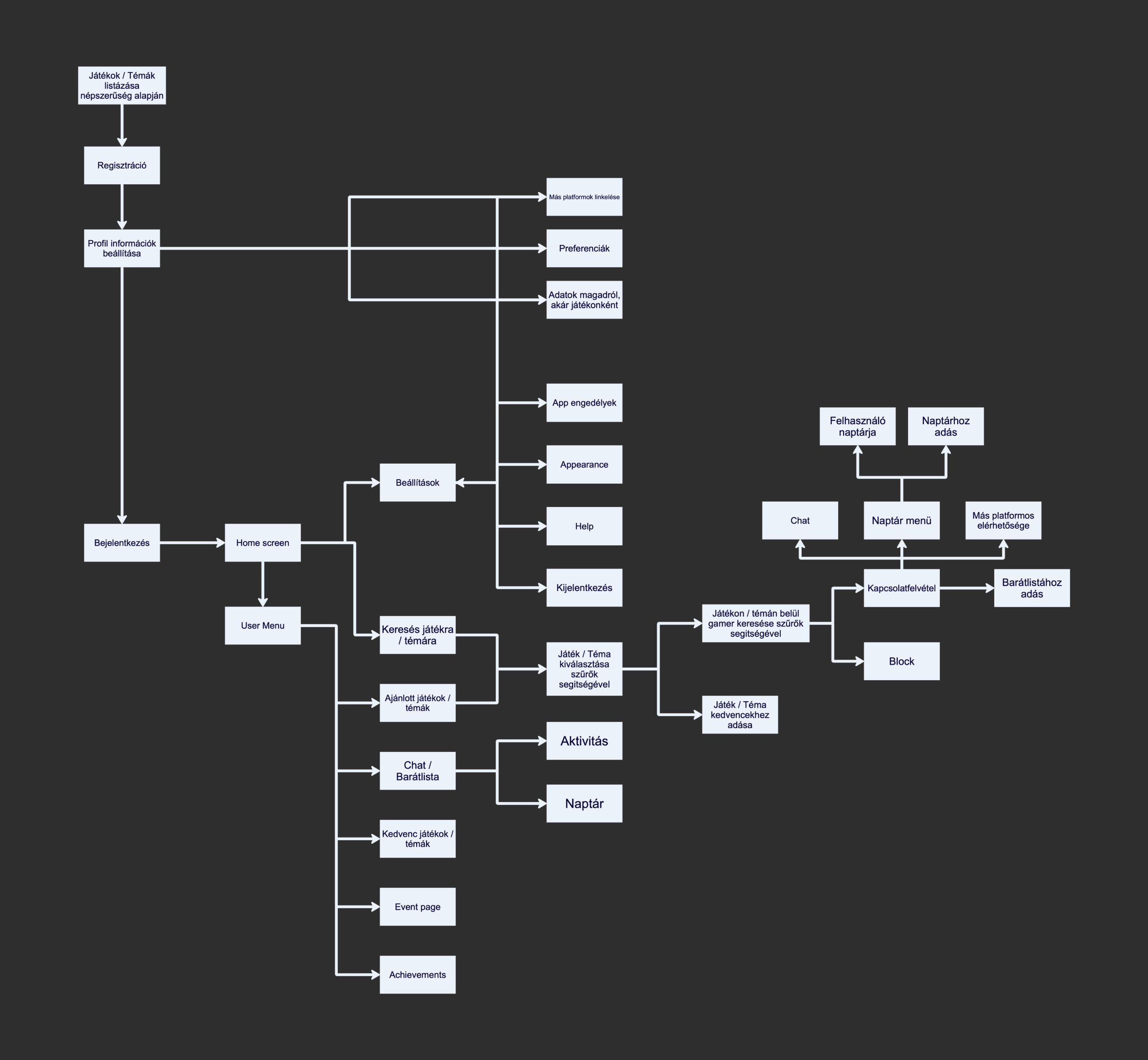 Ebben a szakaszban az alkalmazás struktúrájának és működésének vizuális megtervezése történt meg. A user flow ábrázolja a fő funkciók közötti kapcsolatokat és a navigáció logikáját, míg a wireframe-ek az egyes képernyők leegyszerűsített, vizuális vázlatait mutatják be. Ez a lépés alapozta meg a végleges UI design kialakítását.