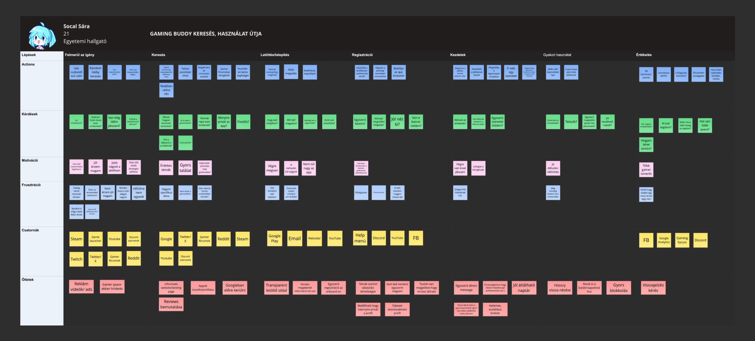 Az egyik kiválasztott perszónához készített journey map bemutatja, hogyan jut el a felhasználó az alkalmazás felfedezésétől a regisztráción át a tényleges használatig.